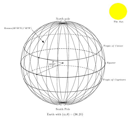 \input fig4tex.tex % 1. Definition of characteristic points \figinit{5cm,orthogonal} % \Valpsi is here a count register to be used in "\advance" computation of angles % to get the approximate limits between solid and dashed parallels \newcount\Valpsi\Valpsi=38\def\Valtheta{20} % Latitude of tropic lines is 23deg 27' N and S \def\latitropic{23.45} \def\sintropic{0.39795}\def\costropic{0.91741} % Earth radius is set to 1 \def\R{1}\def\Rsun{0.21} % for the show ! \figpt 1:(0,0)\figpt 2:(\R,0)\figpt 3:North pole(0,0,\R)\figpt 0:(0,\R) \figpt 4:(0,0,\sintropic)\figpt 5:(\costropic,0,\sintropic) \figpt 6:(0,\costropic,\sintropic)\figpt 7:(0,0,-\sintropic) \figpt 8:(\costropic,0,-\sintropic)\figpt 9:(0,\costropic,-\sintropic) \figvectC 20(0,0,1)\figptcopy 11:/2/ % starting point for the meridian loop \figvectC 21(0,-1,0) % rotation vector for angle of tropic \figpt30:(0,1.3,1.3)\figptrot 30:=30/1,\the\Valpsi,20/ % center of the sun % Rennes : 48deg 06' 53"N, 1deg 40' 46" W (just off Greenwich meridian) \figpt 40:Rennes(0.706,-0.01,0.7071)\figpthom 41:=40/1,1.65/ % Setting view angles \figset projection(longitude=\the\Valpsi, latitude=\Valtheta) % % 2. Creation of the graphical file \psbeginfig{} % 12 meridians drawn in a 12-step loop \newcount\meridians\meridians=12 \loop\ifnum\meridians>0\pscirc 1,11,3(\R)\figptrot 11:=11/1,15,20/ \advance\meridians-1\repeat % Tropic lines, solid in the foreground, dashed in the background \newcount\angleone\angleone=-90\advance\angleone by\Valpsi \newcount\angletwo\angletwo=90\advance\angletwo by\Valpsi \psset (width=.7) \psarccirc 4,5,6;\costropic(\the\angleone,\the\angletwo) \psarccirc 7,8,9;\costropic(\the\angleone,\the\angletwo) \advance\angleone by360 \psset (dash=8) \psarccirc 4,5,6;\costropic(\the\angletwo,\the\angleone) \psarccirc 7,8,9;\costropic(\the\angletwo,\the\angleone) % Equator, thicker and solid in the foreground, dashed in the background \newcount\angleone\angleone=-90\advance\angleone by\Valpsi \psset (dash=\defaultdash, width=1) \psarccirc 1,2,0;\R(\the\angleone,\the\angletwo) \advance\angleone by360 \psset (dash=8)\psarccirc 1,2,0;\R(\the\angletwo,\the\angleone) \psreset {first} % An arrow to Rennes \psset arrowhead(fillmode=yes)\psarrow[41,40] \figptrot 13:=2/1,\latitropic,21/\psline[13,1,2] \psset arrowhead(fillmode=no, length=0.04) \figptshom14=2,13/1,0.4/\psarrowcirc 1,14,15;0.4(0,\latitropic) % A circle in the projection plane will be the sun \psset (color=\Yellowrgb, fillmode=yes)\pscirc 30,1,3(\Rsun) \psendfig % % 3. Writing text on the figure \figptrot 13:=2/1,\latitropic,21/\figptshom14=2,13/1,0.4/% in case not in update mode % \figvisu{\figBoxA}{Earth with $(\psi, \theta)=(\the\Valpsi, \Valtheta)$}{ \figwriten 3:(10pt)\figpt3:(0,0,-\R)\figwrites 3:South Pole(17pt) \figptbary 4:[14,15;1,1]\figwritew 4:$\scriptstyle23^\circ27'$(-10pt) % \figptrot 11:=2/1,\latitropic,21/ \figwritenw41: $\scriptstyle {Rennes (48^\circ 06' N, 1^\circ 40' W)}$(1pt) \figwrites30: $\scriptstyle {The\ Sun}$(.23) \figwrites30: \kern-35pt$\scriptstyle {Tropic\ of\ Cancer}$(.80) \figwrites30: \kern-50pt$\scriptstyle {Equator}$(1.20) \figwrites30: \kern-28pt$\scriptstyle {Tropic\ of\ Capricorn}$(1.6) \figsetmark{$\figBullet$}\figwritep[1,2,11] } \par\centerline{\box\figBoxA} \bye |