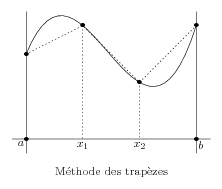 \input fig4tex.tex %%%%%%%%%%%%%%%%%%%%%%%%%%%%%%%% %%%%%%%% DEBUT DESSIN TRAPEZE %%%%%%%%%%%%%%%%%%%%%%%%%%%%%%% \figinit{1truecm} \figpt 1:(-0.5,0)\figpt 2:(6.5,0)\figpt 3:(6,4.5)\figpt 4:(6,-0.5) \figpt 5:(0,4.5)\figpt 6:(0,-0.5) % courbe \figpt 10:(0,3)\figpt 11:(2,4)\figpt 12:(4,2)\figpt 13:(6,4) \figptscontrol 15[10,11,12,13] % vecteur \figvectC 30(1,0) % i \figvectC 31(0,1) % j % autres points \figptinterlines 7:[6,31;1,30]\figptinterlines 8:[4,31;1,30] % a et b \figptinterlines 20:[12,30;4,31] \figptinterlines 21:[12,31;1,30] \figptinterlines 22:[11,30;12,31] \figptinterlines 23:[11,31;1,30] \figptinterlines 24:[10,30;11,31] %% test %%%%%%%%%%%%%%%%%%%%% %% fichier graphique %%%%%%%%%%%%%%%%%%% \psbeginfig{} \psline[1,2]\psline[3,4]\psline[5,6] \psBezier 1[10,15,16,13] \pssetdash{5} \psline[10,11,12,13]\psline[11,23]\psline[12,21] \pssetdash{\defaultdash} \psendfig %%%%%%%%%%%%%%%%%%% %% writing %%%%%%%%%%%%%%%%%%% \figvisu{\figBoxA}{M\'ethode des trap\`ezes}{ \figwrites 23:$x_1$(0.1)\figwrites 21:$x_2$(0.1) %\figwritee 15:$y={f(x)}$(0.1) \figsetmark{$\bullet$} \figwritesw 7:$a$(0.1)\figwritese 8:$b$(0.1) \figwritec[11,12,10,13 ]{$\bullet$} } \box\figBoxA \bye |