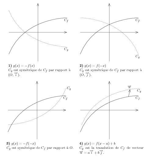 \input fig4tex.tex %%%%% %%% debut dessin %%%%%%%%%%%% %% definition des points \figinit{.7cm} % coordonnes donnees en cm % pt pour tracer les axes \figpt 1:(-4,0)\figpt 2:(4,0)\figpt 3:(0,-4)\figpt 4:(0,4) % pt pour tracer la courbe \figpt 10:(-4,-3) \figpt 11:(-2,2) \figpt 12:(4,2) \figpt 13:(4,2) %%%%%% %%% creation du fichier ps pour sym Ox %%%%%%% \figptssym 14=10,11,12,13/1,2/ \psbeginfig{} % dessin des axes \psarrow[1,2]\psarrow[3,4] % dessin de la courbe de base \psBezier 1[10,11,12,13] % dessin de la sym par rapport a Ox \pssetdash{5} \psBezier 1[14,15,16,17] \psendfig % fin de la creation du fichier ps %%% ecriture sur le dessin \newbox\symOx \figvisu{\symOx} {\vbox{\hsize=6cm {\bf 1)} $g(x)=-f(x)$\hfill\break $C_g$ est sym\'etrique de $C_f$ par rapport \`a $(O,\overrightarrow{i}).$}}{ \figwrites 13:$C_f$ (.1) \figwrites 16:$C_g$ (.1) } %%%%%%%%%%%% %%%%% creation du fichier du ps pour sym Oy \figptssym 14=10,11,12,13/3,4/ \psbeginfig{} % dessin des axes \psarrow[1,2]\psarrow[3,4] % dessin de la courbe de base \psBezier 1[10,11,12,13] % dessin de la sym par rapport a Ox \pssetdash{5} \psBezier 1[14,15,16,17] \psendfig % fin de la creation du fichier ps %%% ecriture sur le dessin \newbox\symOy \figvisu{\symOy}{\vbox{\hsize=6cm {\bf 2)} $g(x)=f(-x)$\hfill\break $C_g$ est sym\'etrique de $C_f$ par rapport \`a $(O,\overrightarrow{j}).$}}{ \figwrites 13:$C_f$ (.1) \figwrites 14:$C_g$ (.1) } %%%%%%%%%%%% %%%%% creation du fichier du ps pour sym O \figpt 0:(0,0) \figptshom 14=10,11,12,13/0,-1/ \psbeginfig{} % dessin des axes \psarrow[1,2]\psarrow[3,4] % dessin de la courbe de base \psBezier 1[10,11,12,13] % dessin de la sym par rapport a O \pssetdash{5} \psBezier 1[14,15,16,17] \psendfig % fin de la creation du fichier ps %%% ecriture sur le dessin \newbox\symO \figvisu{\symO}{\vbox{\hsize =6.5 cm{\bf 3)} $g(x)=-f(-x)$\hfill\break $C_g$ est sym\'etrique de $C_f$ par rapport \`a $O.$}}{ \figwrites 13:$C_f$ (.1) \figwritee 14:$C_g$ (.1) } %%%%%%%%%%%% %%%%% creation du fichier du ps pour trans \figvectC 0(.2,1) %% pt de depart du vecteur de translation \figptBezier 19::0.7[10,11,12,13] \figptstra 14=10,11,12,13,19/1,0/ \psbeginfig{} % dessin des axes \psarrow[1,2]\psarrow[3,4] % trace du vecteur de translation \psarrow[19,18] % dessin de la courbe de base \psBezier 1[10,11,12,13] % dessin de la sym par rapport a Ox \pssetdash{5} \psBezier 1[14,15,16,17] \psendfig % fin de la creation du fichier ps %%% ecriture sur le dessin \newbox\trans \figvisu{\trans}{\vbox{\hsize=6.2 cm {\bf 4)} $g(x)=f(x-a)+b$\hfill\break $C_g$ est la translation de $C_f$ de vecteur $\overrightarrow{u}=a\overrightarrow{i}+b\overrightarrow{j}.$}}{ \figwrites 13:$C_f$ (.1) \figwrites 17:$C_g$ (.1) \figwriten 18:$\overrightarrow{u}$ (.15) } %%%%%% \medskip %%%%%% \line{\hfill\box\symOx\hfill\hfill\box\symOy\hfill} \smallskip %%%%% \line{\hfill\vtop{\unvbox\symO}\hfill\hfill\vtop{\unvbox\trans}\hfill} %%%%%%% \bye |