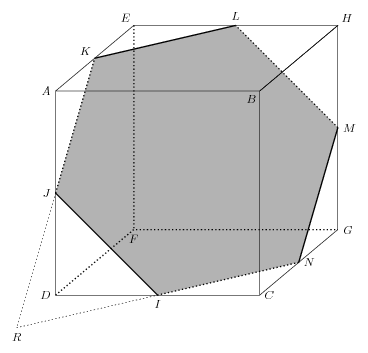 \input fig4tex.tex %%%%%%%% DEBUT DESSIN cube sept %%%%%%%%%%%%%%%%%%%%%%%%%%%%%%% \figinit{3cm,3D} % axe \figpt 1:(0,0,0)\figpt 2:(0,0,2)\figpt 3:(0,2,2) \figpt 4:(2,2,2)\figpt 5:(2,0,2) \figpt 6:(2,0,0)\figpt 7:(2,2,0)\figpt 8:(0,2,0) \figpt 9:(0,0,1)\figpt 20:(1,0,0) \figpt 10:(0,1,2) \figvectP 14[3,4] \figvectN 15[20,9,10] \figptinterlineplane 12 :[3,14; 20,15] \figvectP 16[7,4] \figptinterlineplane 11 :[7,16; 20,15] \figvectP 19[6,7] \figptinterlineplane 18 :[6,19; 20,15] \figvectN 21[1,6,7] \figvectP 22[10,9] \figptinterlineplane 23 :[9,22; 1,21] %%%%%%%%%%%%%%%%%%%%% %% fichier graphical %%%%%%%%%%%%%%%%%%% \psbeginfig{} \psset(width=1,fillmode=yes,color=0.7)\psline[20,9,10,12,11,18,20] \psreset{first} \psline[1,2,3,4,5,2]\psline[1,6,7,4,5,6] %\psline[20,9,10,11] \psset(width=1)\psline[10,12]\psline[20,9]\psline[11,18] \psset(dash =5) \psline[1,8,7]\psline[3,8] \psset(width=1)\psline[9,10]\psline[11,12]\psline[18,20] \psreset{first} \psset(dash=5)\psline[9,23,20] \psendfig %%%%%%%%%%%%%%%%%%% %% writing %%%%%%%%%%%%%%%%%%% \def\DIM{0.05} \figvisu{\figBoxA}{}{ \figwritew 1:$D$(\DIM) \figwritew 2:$A$(\DIM) \figwritenw 3:$E$(\DIM) \figwritene 4:$H$(\DIM) \figwritesw 5:$B$(\DIM) \figwritee 6:$C$(\DIM) \figwritee 7:$G$(\DIM) \figwrites 8:$F$(\DIM) \figwritew 9:$J$(\DIM) \figwritenw 10:$K$(\DIM) \figwritee 11:$M$(\DIM) \figwriten 12:$L$(\DIM) \figwritee 18:$N$(\DIM) \figwrites 20:$I$(\DIM) \figwrites 23:$R$(\DIM) } \box\figBoxA \bye |