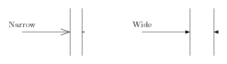 % 1. Definition of characteristic points \figinit{cm} \figpt 0:(-1,0)\figpt 1:(1,0)\figpt 2:(1,1)\figpt 3:(1,-1) \figvectC 20(0.5,0)\def\VTrans{20} \figptstra 4=1,2,3/1,\VTrans/ \figptcopy10:/0/ \def\LTrans{10}\figpttra 11:=0/\LTrans,\VTrans/ % 2. Creation of the graphical file \psbeginfig{} \psline[2,3]\psline[5,6] \psset arrowhead(ratio=0.2)\psarrow [0,1] \psset arrowhead(out=yes)\psarrowhead [1,4] \figptstra 0=0,1,2,3,4,5,6/\LTrans,\VTrans/\figptstra 4=4,5,6/1,\VTrans/ \psline[2,3]\psline[5,6] \psreset{arrowhead} \psset arrowhead(fillmode=yes,length=0.2)\psarrow[0,1] \psset arrowhead(out=yes)\psarrowhead[1,4] \psendfig % 3. Writing text on the figure \figvisu{\figBoxA}{}{ \figwriten 10:Narrow(0.2)\figwriten 11:Wide(0.2) } \centerline{\box\figBoxA} |