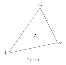 \input fig4tex.tex % % 1. Definition of characteristic points \figinit{pt} %Vertices of the triangle \figpt 1:(80.5, 120) \figpt 2:(-10, -10) \figpt 3:(130, 20) %and the barycenter \figptbary 5:c.g.[1,2,3 ; 1,1,1] % % 2. Creation of the graphical file \psbeginfig{} %A closed line to draw the triangle \psline[1,2,3,1] \psendfig % % 3. Writing text on the figure \figvisu{\figBoxA}{Figure 1} { \figwriten 1:(4) \figwritew 2:(2) \figwritee 3:(2) \figsetmark{$\bullet$} \figwrites 5:$G$(4) } \centerline{\box\figBoxA} \bye |