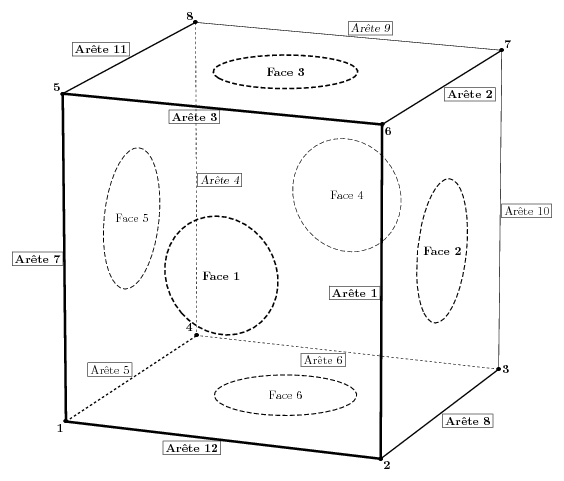 \input fig4tex.tex % % 0. Initialization of variables (macros) \def\Obdist{5000}\def\Valpsi{-68}\def\Valtheta{15} % Setting 3D parameters % \figinit{pt,realistic} % Setting view angles for 'realistic' projection and observation distance \figset projection(longitude=\Valpsi, latitude=\Valtheta, distance=\Obdist) % 1. Characteristic points \def\dist{280} % Edge length \figpt 1:(0,0) % Defining 1 point \figpttraC 2:=1/\dist,0,0/ % 3D translations in 'z=0' plane \figpttraC 3:=1/\dist,\dist,0/ \figpttraC 4:=1/0,\dist,0/ \figvectC 10(0,0,\dist)\figptstra 5=1,2,3,4/1,10/ % 3D vertical translations \figptbary21:[1,2,6,5;1,1,1,1] % Barycenters of faces \figptbary22:[2,3,7,6;1,1,1,1] \figptbary23:[5,6,7,8;1,1,1,1] \figptbary24:[3,4,8,7;1,1,1,1] \figptbary25:[4,1,5,8;1,1,1,1] \figptbary26:[1,2,3,4;1,1,1,1] % 2. Creation of the graphical file \psbeginfig{} \psset (width=2)\psline[1,2,6,5,1] % Drawing the edges of the cube \psset (width=.4)\psline[3,7,8] \psset (dash=4)\psline[3,4,8] \psset (width=1)\psline[1,4] \psset (dash=1)\psline[2,3]\psline[5,8]\psline[6,7] \psset (dash=3) % Drawing dashed circles on faces \psset (width=1.2)\pscirc21,1,2(50) \psset (width=0.8)\pscirc22,2,3(60) % with different width \psset (width=1.2)\pscirc23,5,6(60) \psset (width=0.4)\pscirc24,3,4(50) \psset (width=0.6)\pscirc25,4,1(60) \psset (width=0.8)\pscirc26,1,2(60) \psendfig % 3. Writing text on the figure \def\dist{3pt} \figvisu{\figBoxA}{}{% An empty caption for the figure \figsetmark{$\figBullet$}\figsetptname{{\bf#1}} % Boldface numbers for vertices \figwritesw 1:(\dist)\figwritese 2:(\dist) \figwritee 3:(\dist)\figwritenw 4:(5pt) \figwritenw 5:(\dist)\figwritese 6:(\dist) \figwritene 7:(\dist)\figwritenw 8:(\dist) \figsetmark{} % Comments for edges at middle point using "\boxit" macro, undefined here % bold face for 'foreground' edges, \figptbary 0:[2,6;1,1]\figwritew 0:\boxit{2pt}{\bf Ar\^ete 1}(1pt) \figptbary 0:[7,6;1,1]\figwritese0:\boxit{2pt}{\bf Ar\^ete 2}(1pt) \figptbary 0:[5,6;1,1]\figwritesw0:\boxit{2pt}{\bf Ar\^ete 3}(1pt) % slanted for 'background' edges. \figptbary 0:[4,8;1,1]\figwritee 0:\boxit{2pt}{\sl Ar\^ete 4}(1pt) \figptbary 0:[4,1;1,1]\figwritenw0:\boxit{2pt}{Ar\^ete 5}(1pt) \figptbary 0:[4,3;1,1]\figwritesw0:\boxit{2pt}{Ar\^ete 6}(1pt) \figptbary 0:[1,5;1,1]\figwritew 0:\boxit{2pt}{\bf Ar\^ete 7}(1pt) \figptbary 0:[3,2;1,1]\figwritese0:\boxit{2pt}{\bf Ar\^ete 8}(1pt) \figptbary 0:[8,7;1,1]\figwritene0:\boxit{2pt}{\sl Ar\^ete 9}(1pt) \figptbary 0:[3,7;1,1]\figwritee 0:\boxit{2pt}{Ar\^ete 10}(1pt) \figptbary 0:[8,5;1,1]\figwritenw0:\boxit{2pt}{\bf Ar\^ete 11}(1pt) \figptbary 0:[1,2;1,1]\figwritesw0:\boxit{2pt}{\bf Ar\^ete 12}(1pt) % Comments for faces at barycenter of each face % boldface for 'foreground' faces 1,2,3 \figwritec[21]{\bf Face 1}\figwritec[22]{\bf Face 2} \figwritec[23]{\bf Face 3}\figwritec[24]{Face 4} \figwritec[25]{Face 5}\figwritec[26]{Face 6} } \par\centerline{\box\figBoxA} \bye |