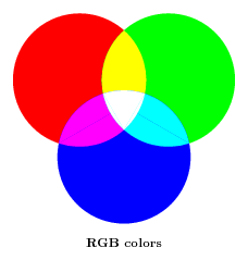 % 1. Definition of characteristic points \figinit{0.6cm} \def\xB{2} % Abscissa of B \def\R{3} % Radius of the 3 circles, r < R < r*sqrt(3), % r radius of the circumscribed circle (r=2*\xB/sqrt(3)=2.3094) \figpt 1:A(-\xB, 0) \figpt 2:B(\xB, 0) \figptrot 3:C=2/1,-60/ \figptsintercirc 4[1,\R;2,\R] \figptsintercirc 14[3,\R;1,\R] \figptsintercirc 24[2,\R;3,\R] % 2. Creation of the graphical file \psbeginfig{} \psset(fillmode=yes) \psset(color=\Redrgb) \pscirc 1(\R) \psset(color=\Greenrgb)\pscirc 2(\R) \psset(color=\Bluergb) \pscirc 3(\R) \psset(color=\Yellowrgb) \psarccircP1;\R[4,5] \psarccircP2;\R[5,4] \psset(color=\Magentargb)\psarccircP1;\R[15,14]\psarccircP3;\R[14,15] \psset(color=\Cyanrgb) \psarccircP3;\R[25,24]\psarccircP2;\R[24,25] \psset(color=\Whitergb) \psarccircP2;\R[24,4]\psarccircP1;\R[4,14]\psarccircP3;\R[14,24] \psline[4,14,24] \psendfig % 3. Inserting the figure \figvisu{\figBoxA}{\bf RGB colors}{} \centerline{\box\figBoxA} |