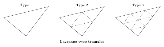 % 1. Definition of characteristic points \figinit{pt} \figpt 1:(-10, 10) \figpt 2:(110, 40) \figpt 3:(50, -40) \figptbary 11:[1,2,3 ; 1,1,1]\figpttraC 11:=11/0,40/ \figvectC 10(150,0)\figptstra 12=11,12/1,10/ % 2. Creation of the graphical file \psbeginfig{} \pstrimesh 1 [1,2,3] \figptstra 1=1,2,3/1,10/\pstrimesh 2 [1,2,3] \psset second(dash=5) \figptstra 1=1,2,3/1,10/\pstrimesh 3 [1,2,3] \psendfig % 3. Writing text on the figure \figvisu{\figBoxA}{\bf Lagrange type triangles}{ \figwritec[11]{Type 1}\figwritec[12]{Type 2}\figwritec[13]{Type 3} } \centerline{\box\figBoxA} |