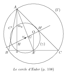% Cercle d'Euler % 1. Definition des points caracteristiques de la geometrie \figinit{0.8cm} % Sommets \figpt 1:$A$(0,3) \figpt 2:$B$(-1,-2) \figpt 3:$C$(5,-2) \figptbary 11:$A'$[2,3;1,1] \figptbary 12:$B'$[1,3;1,1] \figptbary 13:$C'$[1,2;1,1] \figptcircumcenter 4:$O$[1,2,3]\figgetdist\Rcc[1,4] \figptorthocenter 5 :$H$[1,2,3] \figptbary 21:$m_a$[1,5;1,1] \figptbary 6:$\omega$[4,5;1,1]\figgetdist\Rce[11,6] \figptbary 7:$G$[1,2,3;1,1,1] \figptorthoprojline 31 :$a$=1/2,3/ % 2. Creation du fichier graphique \psbeginfig{} \psline[1,2,3,1]\psline[1,31]\psline[1,11]\psline[11,4] \pscirc 4(\Rcc)\pscirc 6(\Rce) \figptbary 40:[4,5;2,-1]\figptbary 41:[4,5;-2,5]\psline[40,41] \psendfig % 3. Inscription du texte sur le dessin \def\dist{2pt} \figvisu{\figBoxA}{\it Le cercle d'Euler \rm(p. 108)}{% \figwritenw 1,13:(\dist)\figwritesw 2:(\dist)\figwritese 3,5:(\dist) \figwritene 12:(\dist)\figwrites 11,31:(\dist)\figwriten 4:(\dist) \figwritegce 7:(\dist,-1pt)\figwritege 21:(\dist,-0.1pt) \figptcirc 0 :$(\Gamma)$: 4;\Rcc (45)\figwritene 0:(\dist) \figptcirc 0 :$(\gamma)$: 6;\Rce (-15)\figwritese 0:(\dist) \figsetmark{$\figBullet$}\figwritenw 6:(\dist) } \centerline{\box\figBoxA} |