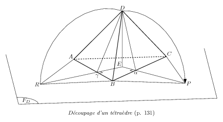 % Decoupage d'un tetraedre % 1. Definition des points caracteristiques de la geometrie \figinit{4cm,ortho} % Sommets \figpt 1:$D$(0.4,0.7,0.9) \figpt 2:$A$(0,0) \figpt 3:$B$(1,0.5) \figpt 4:$C$(0,1.4) % Plan de base (11,12,13,14) \figpt 11:(-0.3,-1)\figpttraC 12:$F_D$=11/2.2,0,0/ \figvectC 0(0,3)\figptstra 13=12,11/1,0/ % Points dans le plan de base \figvectC 10(0,0,1)% Vecteur orthogonal au plan de base \figptorthoprojplane 5:$E$=1/2,10/ \figptorthoprojline 6:$\gamma$=5/2,3/\figgetdist\Rcg[1,6] \figvectP 0[5,6]\figvectU 0[0]\figpttra 16:$R$=6/\Rcg,0/ \figptorthoprojline 7:$\alpha$=5/3,4/\figgetdist\Rca[1,7] \figvectP 0[5,7]\figvectU 0[0]\figpttra 17:$P$=7/\Rca,0/ % \figset proj(psi=-5,theta=20) % 2. Creation du fichier graphique \psbeginfig{} % Plan de base \psline[11,12,13,14] \psarccircP 12 ; 0.3 [13,11,11] % \def\DIM{0.06} \psline[1,5]\psline[1,6]\psline[1,7] \psaltitude \DIM[5,2,3]\psaltitude \DIM[5,4,3] \psline[6,16]\psline[2,16,3] \psline[7,17]\psline[3,17,4] \psarccircP 6;\Rcg[1,16,16] \psset arrow(fill=yes)\psarrowcircP 7;\Rca[1,17,17] % Aretes externes du tetraedre \psset(join=round,width=0.8)\psline[1,2,3,1,4,3] \psset(dash=4)\psline[2,4] \psendfig % 3. Inscription du texte sur le dessin \def\dist{2pt} \figvisu{\figBoxA}{\it D\'ecoupage d'un t\'etra\`edre \rm(p. 131)}{% \figwriten 1:(\dist)\figwritenw 2,5:(\dist) \figwrites 6:(3pt)\figwritene 4:(\dist) \figwrites 3,7:(\dist) \figwritew 16:(\dist)\figwritee 17:(\dist) \figwritege 12:(6pt,2pt) } \centerline{\box\figBoxA} |
