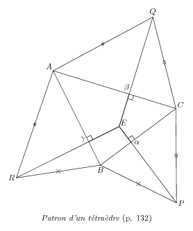 % Patron d'un tetraedre % 1. Definition des points caracteristiques de la geometrie \figinit{4cm} % Sommets \figpt 1:$A$(0,0) \figpt 2:$B$(0.5,-1) \figpt 3:$C$(1.3,-0.4) \def\RadA{1.2}\def\RadB{0.9}\def\RadC{1} \figptsintercirc 11 [2,\RadB ; 3,\RadC] \figptsintercirc 12 [3,\RadC ; 1,\RadA] \figptsintercirc 13 [1,\RadA ; 2,\RadB] \figptorthoprojline 21:$\alpha$=11/2,3/ \figptorthoprojline 22:$\beta$=12/1,3/ \figptorthoprojline 23:$\gamma$=13/1,2/ \figvectN 51[2,3]\figvectN 52[1,3] \figptinterlines 4:$E$[11,51; 12,52] % 2. Creation du fichier graphique \psbeginfig{} \psline[1,2,3,1] \psline[1,13,2,11,3,12,1] \psline[11,4]\psline[12,4]\psline[13,4] \def\DIM{0.05} \psaltitude \DIM[4,2,3]\psaltitude \DIM[4,1,3]\psaltitude \DIM[4,2,1] \psendfig % 3. Inscription du texte sur le dessin \def\dist{2pt}\def\Dist{4pt} \figvisu{\figBoxA}{\it Patron d'un t\'etra\`edre \rm(p. 132)}{% \figwritenw 1:(\dist)\figwrites 2:(\dist)\figwritene 3:(\dist) \figwritee 11:$P$(\dist)\figwriten 12:$Q$(\dist)\figwritew 13:$R$(\dist) \figwritene 4:(\dist) \figwritee 21:(\Dist)\figwritegw 22:(0,\Dist)\figwritegw 23:(4pt,0.1pt) \figsetmark{$\times$} \figptbary 41:[13,2;1,1]\figptbary 42:[11,2;1,1]\figwritep[41,42] \figsetmark{$\figCirc$} \figptbary 41:[11,3;1,1]\figptbary 42:[12,3;1,1]\figwritep[41,42] \figsetmark{$\star$} \figptbary 41:[12,1;1,1]\figptbary 42:[13,1;1,1]\figwritep[41,42] } \centerline{\box\figBoxA} |
