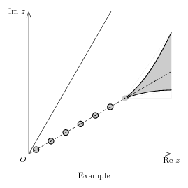\documentclass[12pt]{article} \begin{document} \input fig4tex %%%%%%%%%%%%%%%%%%%%%%%%%%%%%%%%%%%%%%%%%%%%%%%%%%%%%%%%%%%%%%%%%%%%%%%%%%%% % % 1. Definition des points caracteristiques de la geometrie \figinit{1.2cm} \figpt 0:$O$(0,0)\figpt 1:Re $z$(5,0)\figpt 2:(0,5)\figpt 4:(5,5) % \figptrot 3:=1/0,60/ \figvectP 11[0,1]\figvectP 13[0,3]\figptinterlines 5 :[2,11; 0,13] % \figptrot 6:=1/0,30/ \figvectP 12[0,2]\figvectP 16[0,6]\figptinterlines 7 :[1,12; 0,16] % \def\LUN{0.06}\def\LDE{0.12}% \LDE= 2*\LUN \figpttra 21:=0/\LUN,16/\figptstra 22=21,22,23,24,25,26,27,28,29/\LDE,16/ \def\LTR{0.1}% \LTR < distance entre 2 points % \figptinterlines 31 :[1,12; 27,13] \figptinterlines 32 :[1,12; 27,11] % \figpttraC 31:=31/0,-0.5/ \figptbary 41:[27,31; 2,1]\figptbary 42:[27,31; 1,2] \figvectN 50[31,27]\figpttra 41:=41/0.1,50/\figpttra 42:=42/0.05,50/ \figptssym 61=41,42,31/0,27/ \figptBezier 65 :: 0.585 [27,61,62,63] \figptBezier 66 :: 0.19334 [27,61,62,63] \figptBezier 67 :: 0.38667 [27,61,62,63] \figptscontrol 68 [27,66,67,65] % % 2. Creation du fichier graphique \psbeginfig{} % Axes + droite \psarrow[0,1]\psarrow[0,2]\psline [0,5] % Zones grises \psset (fillmode=yes,color=0.8)\psline [31,27,32] \pscirc 21(\LTR)\pscirc 22(\LTR)\pscirc 23(\LTR)\pscirc 24(\LTR) \pscirc 25(\LTR)\pscirc 26(\LTR) % Zones blanches \psset (color=1) \psBezier 1[27,41,42,31]\psBezier 1[27,68,69,65]\psline[27,32,65] % \psreset{first} \psset (dash=3)\psline [0,7] \def\EPAIS{0.8} \psset (dash=\defaultdash, width=\EPAIS) \psBezier 1[27,41,42,31]\psBezier 1[27,68,69,65] % \psreset{first}\psset (fillmode=yes,color=0.8)\pscirc 27(\LTR) % \psreset{first}\psset (width=\EPAIS)\psarccirc 27;\LTR(60,0) \pscirc 21(\LTR)\pscirc 22(\LTR)\pscirc 23(\LTR)\pscirc 24(\LTR) \pscirc 25(\LTR)\pscirc 26(\LTR) \psendfig % 3. Inscription du texte sur le dessin \figvisu{\figBoxA}{Example}{% \figwrites 1:(4pt) \figwritew 2:Im $z$(4pt) \figwritesw 0:(4pt) % %\figshowpts[0,9]\figshowpts[21,30] \figsetmark{.}\figwritep[21,22,23,24,25,26,27,28,29,30] %\figshowpts[31,32] %\figshowpts[65,65] } \centerline{\box\figBoxA} %%%%%%%%%%%%%%%%%%%%%%%%%%%%%%%%%%%%%%%%%%%%%%%%%%%%%%%%%%%%%%%%%%%%%%%%%%%% \end{document} |